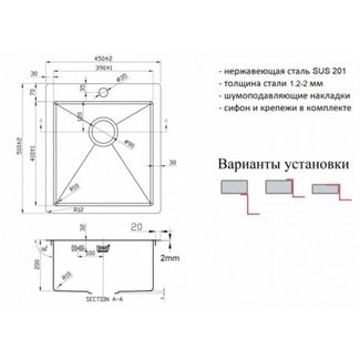 Чаша мойки выполнена из нержавеющей стали SUS201 толщиною 1,2 мм, что делает её достаточно прочной с хорошим шумоподавлением.