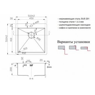 Чаша мойки выполнена из нержавеющей стали SUS201 толщиною 1,2 мм, что делает её достаточно прочной с хорошим шумоподавлением.