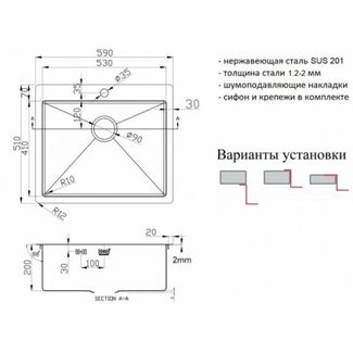 Чаша мойки выполнена из нержавеющей стали SUS201 толщиною 1,2 мм, что делает её достаточно прочной с хорошим шумоподавлением.