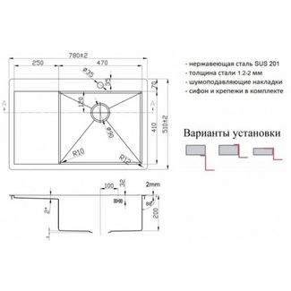 Чаша мойки выполнена из нержавеющей стали SUS201 толщиною 1,2 мм, что делает её достаточно прочной с хорошим шумоподавлением.