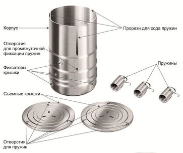 Устройство имеет коническую форму с отверстиями для крепления пресса. В комплекте с устройством для приготовления ветчины поставляются две крышки (верхняя и нижняя с пазами для пружин) и три пружины, которые служат тем самым прессом. Все детали и компоненты изготовлены из нержавеющей стали, что исключает окисление металла и продуктов. Как видим – ничего сложного. И пользоваться приспособлением так же невероятно просто.