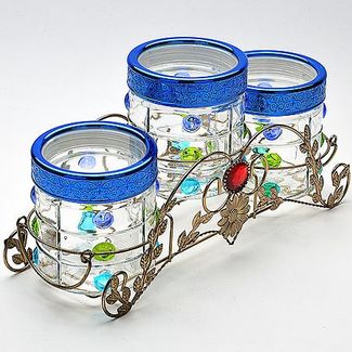 3 банки+подставка МВ(х4). Банка: стекло, пластик. Цвет: прозрачный, синий. Объем банок: 700 мл. D: 11,5 см Высота: 12 см. Подставка: металл. Цвет: бронзовый. Размер упаковки: 34,4 х 14 х 14,6 см. Вес: 1,9 кг. Страна производитель: Китай. Набор из 3-х банок для сыпучих продуктов выполнен из высококачественного стекла и декорирован нежным рисунком. Банки располагаются на изящной ажурной металлической подставке. Набор предназначен для хранения различных сыпучих продуктов: сахара, кофе, чая, специй и т.п. Цветные пластиковые крышки с прозрачным верхом, плотно закрываются и препятствуют проникновению влаги и посторонних запахов внутрь. Необычный и оригинально оформленный набор банок послужит прекрасным подарком и украсит любую кухню. Изделия не впитывают запахи и легко моются. None