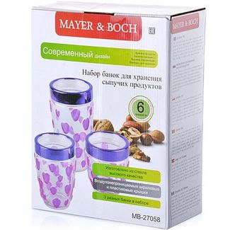 Банки для сыпучих МВ(х6). Банка: стекло. Крышка: пластик. Декоративный рисунок. Объем: 700 мл/1000 мл/1300 мл. Размер: 24,4х 12,3 х 33 см. Вес: 2200 г. Страна производитель: Китай.Набор MAYER& BOCH из 3-х банок для сыпучих продуктов выполнен из высококачественного стекла с декоративным рисунком. Банки предназначены для хранения различных сыпучих продуктов: сахара, кофе, муки, соли, круп, макаронных изделий и т.п. Цветные пластиковые крышки плотно завинчивается и препятствует проникновению влаги и посторонних запахов. Необычная и оригинально оформленная банка украсит любую кухню. Изделие не впитывает запахи и легко моется. None