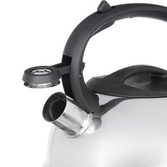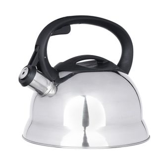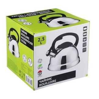Чайник объемом 2,5 л изготовлен из нержавеющей стали, оснащен несъемным свистком на кнопке и бакелитовой ручкой черного цвета, подходит использования на всех типах плит, включая индукцию. None Возможен самовывоз. Есть доставка.
