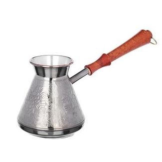 Медная турка для кофе объемом 640 мл хорошо проводит тепло и обеспечивает быстрое приготовление двух порций классического напитка. Материал не боится ржавчины и механических повреждений. Корпус джезвы декорирован изящными орнаментами. Добротная ручка выполнена из натурального дерева. Металлическое кольцо позволяет хранить посуду в подвешенном положении. None Возможен самовывоз. Есть доставка.