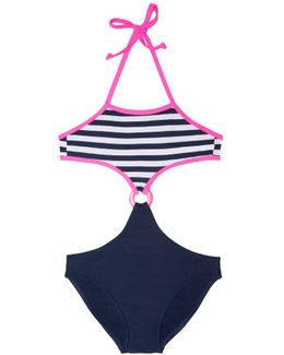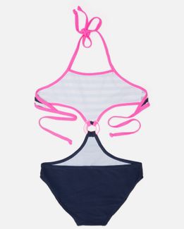 Купальник Infinity by Acoola слитный сине-белый выглядит модно и стильно - однотонные плавки и топ в полоску имеют оригинальный крой передней детали, соединенны при помощи крупного кольца розового цвета. Модель изготовлена из эластичного материала, отличающегося простотой в уходе и устойчивостью к выгоранию.