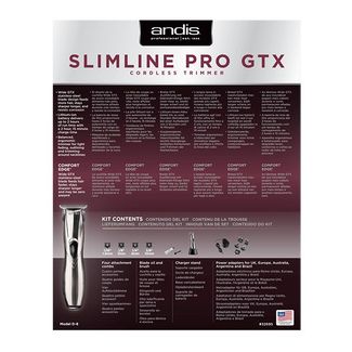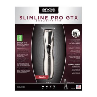 Американский аккумуляторно-сетевой триммер для окантовки волос Andis D8 Slim Line Pro GTX работает от встроенного литиевого аккумулятора. Полного заряда батареи хватает на 2 часа непрерывной работы. Аккумулятор можно заряжать длинными или короткими циклами при любом остатке заряда. На полную зарядку машинки уходит 2,5 часа. Функция питания от провода помогает завершить стрижку, когда батарея разрядилась. Роторный двигатель с 6000 оборотов в минуту создан инженерами Andis для чистой окантовки на волосах всех типов или творческих стрижек. В комплекте идет увеличенный до 40 мм Т-образным GTX-ножом, выполненный из твердой углеродистой стали. Широким ножом Т-образной формы быстрее создают точные окантовочные линии длиной 0,1 (1/10) мм при завершении причесок, скин-фейде, подчистки после машинки, оформлении контуров бороды, усов или баков. Ножевой блок можно настроить на нулевое прилегание Zero-gapped для стрижки с длиной среза от 0,05 мм. Дополнительные 4 уровня высоты стрижки от 1,5 до 10 мм получают с насадками в комплекте. Изменение длины среза насадками выполняют при стрижке бороды, бакенбардов или усов. Насадки с накидным механизмом Snap-On (защелка) без усилий крепятся на нож и не слетают во время стрижки. Сбалансированный корпус триммера удобно лежит в руке, не перевешивая в стороны. Эргономичный корпус повышает маневренность и удобство выполнения тонких работ на волосах. Уменьшенный до 140 г вес не переутомляет руку при интенсивных работах. Комплектация: