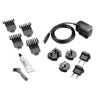 Триммер Зарядная подставка Сетевое зарядное устройство Набор из четырех пластиковых насадок - 1,5мм, 3мм, 6мм, 10мм Масло для смазки ножевого блока Щеточка для чистки ножа Адаптеры для розеток Европы, Австралии, Великобритании