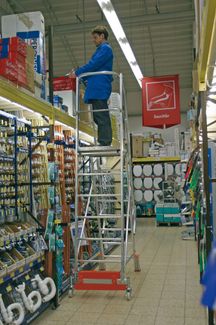 Сфера применения лестницы с платформой "VARIO Компакт", траверса 750 6 ступ. очень обширна: они применяются как в крупных розничных магазинах, так и на складах для разгрузочно-погрузочных работ среди стеллажей.