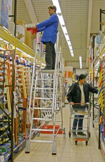 Сфера применения лестниц с платформой "VARIO Компакт", траверса 750 8 ступ. очень обширна: они применяются как в крупных, так и мелких розничных магазинах, так и на складах для разгрузочно-погрузочных работ среди стеллажей. Основные характеристики: односторонняя складная алюминиевая лестница с платформой, с новой системой балластировки;большая алюминиевая рифленая платформа 650 х 600 мм.;различная ширина поперечных траверс с грузовым балластом обеспечивают спокойную работу на большой высоте при небольшой занимаемой площади;уверенный подъем по алюминиевым рифленым ступеням шириной 80 мм.;поручни с двух сторон на лестнице и перила с трех сторон на платформ;применяется в узких проходах между стеллажами, для работы на высоте более 4 метров и ширине прохода 820 мм.высокопрочное соединение ступеней с боковинами;два интегрированных ролика для легкого передвижения лестницы;поставка осуществляется в предварительно собранных модулях;продукт сертифицирован в строгом соответствии с ГОСТ Р 58752-2019 и DIN EN-131.