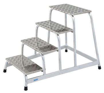 устойчивая сварная конструкция из алюминиевых труб; ступени шириной 240 мм. из рифленого алюминия гарантируют безопасный подъем и устойчивое положение при работе; площадь верхней ступени 305 х 520 мм.; противоскользящие опорные наконечники.