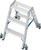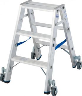Передвижная, двусторонняя алюминиевая стремянка STABILO 2х3 ступеньками с 4 самоблокирующимися роликами 80 мм, с автоматикой „Roll/Stop“ для профессионального применения.