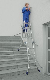 телескопическое выдвижение наружных секций лестницы от перекладины к перекладине позволяют устанавливать лестницу на различных по высоте поверхностях; из внутренних и наружных секций можно создать две отдельные стремянки, которые с помощью строительных подмостков можно составить в рабочий стол или подставку (примечание: в этом варианте для увеличения опорной площади на внутренней стремянке надлежит использовать комбинированную траверсу арт. № 121417); профилированные со всех сторон перекладины для безопасного подъема и спуска; дополнительная устойчивость благодаря угловым раскосам; компактная конструкция позволяет перевозить лестницу в легковом автомобиле; двухкомпонентные опорные заглушки: твердый материал обеспечивает прочное соединение с боковиной, мягкий материал обеспечивает надежное сцепление с опорной поверхностью и препятствует нежелательному скольжению лестницы на гладком полу.