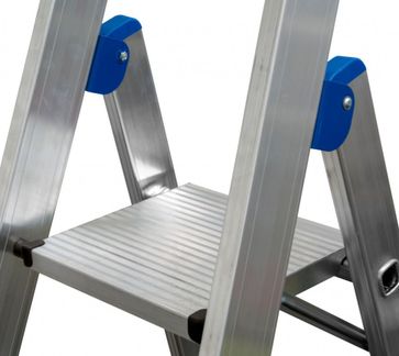 Основные особенности: две алюминиевые планки дополнительно предотвращают самопроизвольное раздвижение или складывание секций лестницы при работе; боковины из алюминиевого прессованного профиля; опорная часть с прочными поперечными распорками; защитные верхние заглушки на опорной части лестницы исключают защемление при раздвижении стремянки; устойчивая профилированная площадка с высокой дугой безопасности для удобного расположения при длительных работа; заменяемая полка для инструментов с крюком для ведра.