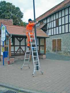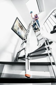телескопическое выдвижение наружных секций лестницы от перекладины к перекладине позволяют устанавливать лестницу на различных по высоте поверхностях;запатентованная система Clickmatic обеспечивает легкую и быструю фиксацию боковин лестницы;из внутренних и наружных секций можно создать две отдельные двусторонние стремянки, которые с помощью строительных подмостков можно составить в рабочий стол или подставку (примечание: в этом варианте для увеличения опорной площади на внутренней стремянке надлежит использовать комбинированную траверсу арт. № 121417);противоскользящие двухкомпонентные опорные заглушки: твердый материал обеспечивает прочное соединение с боковиной, мягкий материал обеспечивает надежное сцепление с опорной поверхностью и препятствует нежелательному скольжению лестницы;четыре телескопических удлинителя боковин (IntegratedTele-System);внутренняя лестница может использоваться как стремянка только вместе с Combi-траверсой (121417);дополнительная устойчивость благодаря угловым раскосам;легко и быстро складывается, умещается в багажнике автомобиля;продукт сертифицирован в строгом соответствии с ГОСТ Р 58752-2019 и DIN EN-131.