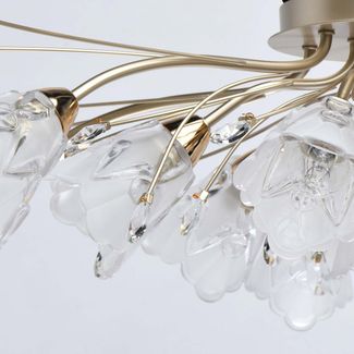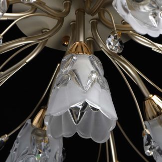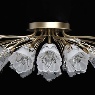 Невысокая люстра Подснежник 294016213 выполнена в классическом стиле. Сочетание матового и глянцевого золота привлекает внимание своим смелым дизайном. Резные плафоны изготовлены из толстого матового стекла, которое рассеивает свет и равномерно освещает комнату.<br>