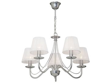 Люстра V3568-9/5 — элегантная классическая модель, регулируется по высоте. Металлическое основание актуального цвета хрома дополнено изящными текстильными абажурами белого цвета.<br>