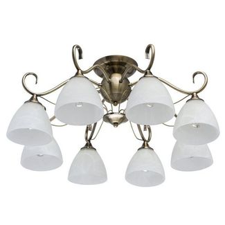 Лампы (в комплекте нет): 8*60W E272700K Основание выполнено из облегченной стали, гальванизировано в цвет античной бронзы. Плафоны: стекло с добавлением алебастра Минимальная сумма заказа 2000 рублей Страна производства: Германия