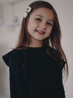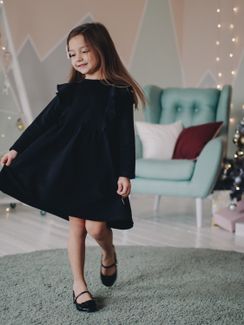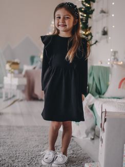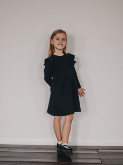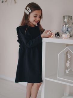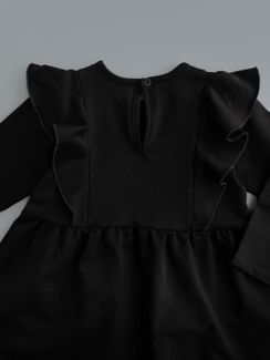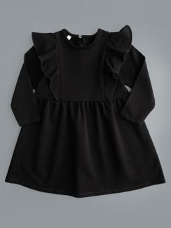 <p>Платье с длинным рукавом и воланом из мягкого хлопкового трикотажа футер качества пенье однотонное черное. На горловине застежка-кнопка.</p> None Возможен самовывоз. Есть доставка.