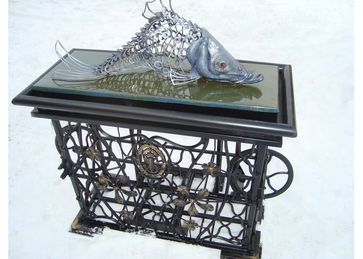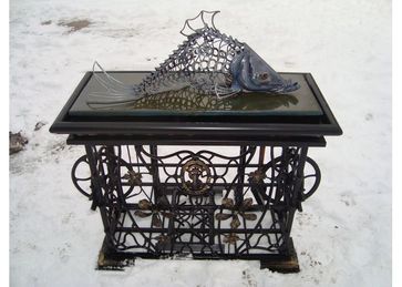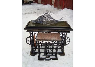 Тело выполнено из проволоки и листового металла. Объемная емкость для дров. Рабочий столик из гранитной плиты. Эксклюзивность - 100%