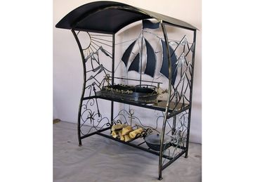Кованый мангал с крышей "Бригантина". Топка выполнена в виде корпуса корабля. Задняя стенка мангала декорирована элементами в виде парусов. Мангал оборудован навесом, вертелом и небольшими полочками по бокам топки для удобства приготовления пищи. None
