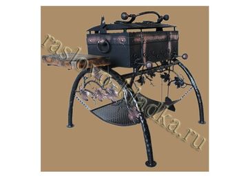 Мангал кованый. Выполнен в виде сундука, расположена на широко расставленных ножках. Декорирован элементами в виде виноградных кистей None