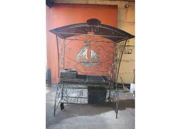 Кованый мангал с крышей "Парус". Оснащен навесом с дымоотводом, полочкой для дров, вертелом и подставкой под казан. None
