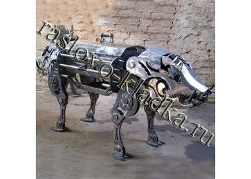 Кованый мангал в виде вепря. Декорирован техническими узлами, в том числе цепными передачами, создающими грозный техногенный вид. При необходимости мангал может быть укомплектован вертелом с электродвигателем и набором для автоматического вращения шампуров. Габаритная длина - 1,8 м. Размер топки (ДхШхГ), мм: 700х350х300. Топка выполнена из листа толщиной 9 мм. Масса мангала - 190 кг. None