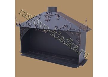 Закрытый сварной мангал с дымосборником, выполненный из листовой стали/ Фасадная часть дымосборника украшена витыми элементами. Верхняя часть дымосборника оснащена патрубком под трубу None