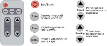 Массажер предлагает Вам 4 автоматических программы роликового массажа, 3 настраиваемых программы и функцию ручной настройки таких характеристик, как скорость и интенсивность массажа. Вы обязательно найдете комфортную и подходящую под самочувствие программу массажа, устанавливая характеристики на встроенной в массажер панели управления или на пульте дистанционного управления.