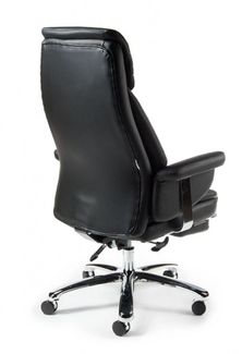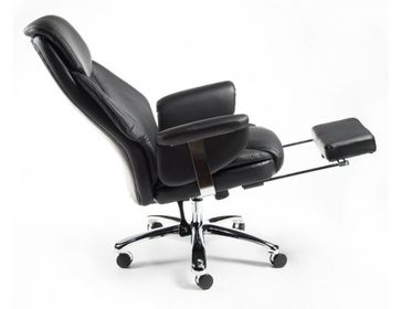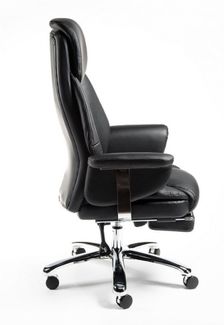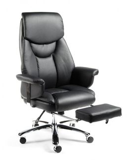 Кресло офисное/Парламент/(black) сталь + хром/черная экокожа Кресло для руководителя высшего звена Парламент своим внешним видом говорит, что его владелец не разменивается по мелочам. Сохранив классические черты, кресло Парламент привлекает внимание оригинальными решениями в стиле Хай-Тек. Обивка выполнена из высококачественной экокожи, в соответствии с современными тенденциями защиты окружающей среды. Роскошное кресло также имеет выдвижную опору для ног, которая позволяет принять максимально комфортное положение, недоступное в большинстве других моделей. Выдвижная подножка для поддержки ног позволяет принять лежачее положение в минуты отдыха, снимает нагрузку с позвоночника, улучшает кровообращение. Хромированный газ-патрон, ролики с вставкой "хром", хромированные части подлокотника делают модель стильной, с элементами дизайна в стиле хай-тек. Кресло подойдет людям высокого роста, плотной комплекции. Максимальная нагрузка 120 кг. Особенности кресла Парламент: