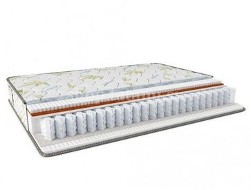Высококачественный трикотажный чехол с объемной стежкой; Натуральный латекс (3см.); латексированная кокосовая койра (1см.); войлок белый; независимый блок пружин (256 пр./кв.м.); войлок белый; натуральный латекс (3см.)