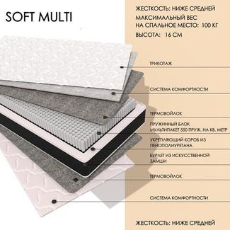 Трикотаж- элитный трикотаж белого цвета, придающий непревзойденную эстетику и изысканность. Приятный на ощупь материал. Система комфортности - это сочетание материалов которые соединяются между собой посредством сшивания, Холлофайбер и специальный пенополиуретан сшиваются на стегальном оборудовании. Это дает плотность и толщину верхнему покрытию матраса. Данное сочетание дает непревзойденный комфорт. Сочетание именно этих материалов не позволяет сбиваться и сминаться поверхности матраса со временем. Термовойлок - это нетканый материал, который нужен для изоляции пружинного блока от комфортных слоев. Термовойлок защищает слои от повреждений, что продлевает срок службы матраса. Также термовойлок обеспечивает более равномерное давление пружин на тело. Это очень долговечный материал, обладающий высокой износоустойчивостью. Материал безопасный, гипоаллергенный. Данный материал используется во всех наших матрасах. Плотность термовойлока составляет 600 г/м2. MultiPocket Блок независимых пружин 550 пружин на кв. метр или 1100 пружин на спальное место - это основа матраса. Блок состоит из пружин диаметром до 4 см. Пружины изготовлены из легированной закаленной стали, благодаря этому они сохраняют форму при длительной эксплуатации матраса. Цель легирования - увеличение механических свойств, прочности, пластичности, ударной вязкости. Такие пружины благодаря своим свойствам сохраняют форму долгие годы. Также каждая пружинка обернута в специальный мешочек из спанбонда (это синтетический материал, обладающий теми же свойствами, что и термовойлок, но имеющий меньшую толщину). Мешочек нужен, чтобы изолировать пружины друг от друга, а также склеивать пружины между собой в точечной связке, а не крепко связанными как в зависимых пружинах - это исключает эффект гамака. Это обеспечивает необходимый для сна ортопедический эффект, который позволяет находиться телу в правильном положении во время сна и отдыха. Multipocket - это увеличенное количество пружин на спальное место, что обеспечив