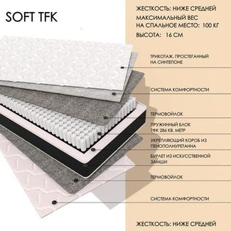Трикотаж- элитный трикотаж белого цвета, придающий непревзойденную эстетику и изысканность. Приятный на ощупь материал. Система комфортности - это сочетание материалов которые соединяются между собой посредством сшивания, Холлофайбер и специальный пенополиуретан сшиваются на стегальном оборудовании. Это дает плотность и толщину верхнему покрытию матраса. Данное сочетание дает непревзойденный комфорт. Сочетание именно этих материалов не позволяет сбиваться и сминаться поверхности матраса со временем. Термовойлок - это нетканый материал, который нужен для изоляции пружинного блока от комфортных слоев. Термовойлок защищает слои от повреждений, что продлевает срок службы матраса. Также термовойлок обеспечивает более равномерное давление пружин на тело. Это очень долговечный материал, обладающий высокой износоустойчивостью. Материал безопасный, гипоаллергенный. Данный материал используется во всех наших матрасах. Плотность термовойлока составляет 600 г/м2. TFK Блок независимых пружин 286 пружин на кв. метр или 550 пружин на спальное место - это основа матраса. Пружины изготовлены из легированной закаленной стали, благодаря этому они сохраняют форму при длительной эксплуатации матраса. Цель легирования - увеличение механических свойств, прочности, пластичности, ударной вязкости. Такие пружины благодаря своим свойствам сохраняют форму долгие годы. Также каждая пружинка обернута в специальный мешочек из спанбонда (это синтетический материал, обладающий теми же свойствами, что и термовойлок, но имеющий меньшую толщину). Мешочек нужен, чтобы изолировать пружины друг от друга, а также склеивать пружины между собой в точечной связке, а не крепко связанными как в зависимых пружинах - это исключает эффект гамака. Это обеспечивает необходимый для сна ортопедический эффект, который позволяет находиться телу в правильном положении во время сна и отдыха. Пружины ТФК дают матрасу стандартный ортопедический эффект, подходящий большинству людей. Укрепляющий короб из пенополиуретана - эт