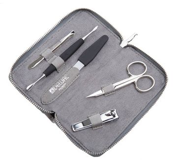 Маникюрный набор Dewal, 5 предметов. Инструменты: ножницы универсальные, книпсер, пинцет наклонный, пилка для ногтей, шабер двухсторонний. Чехол из натуральной кожи, цвет серый None Возможен самовывоз. Есть доставка.