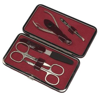 Маникюрные Инструменты: ножницы для ногтей, ножницы для кутикул, металлическая пилка, пинцет наклонный, кусачки для кожи; покрытие - никель. Футляр из натуральной кожи, цвет бордовый. None Возможен самовывоз. Есть доставка.
