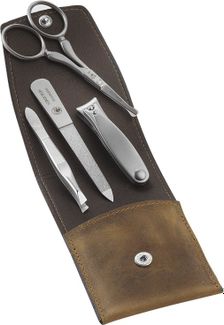 Маникюрный набор Dovo, 4 предмета. Инструменты: ножницы универсальные, пилка, пинцет наклонный, книпсер; покрытие матовое. Футляр: натуральная кожа (вол), цвет коричневый. Размер 6,5 x 3 x 11,5 см None Возможен самовывоз. Есть доставка.