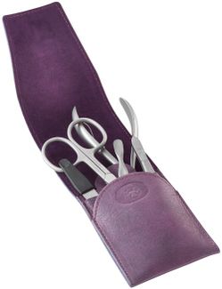 Маникюрный набор Dovo, 5 предметов. Инструменты: ножницы универсальные, кусачки для кутикул, пилка металлическая, пинцет наклонный, маникюрный шабер. Футляр: натуральная кожа (вол), цвет фиолетовый. Размер 6 x 2,5 x 12 см None Возможен самовывоз.