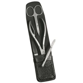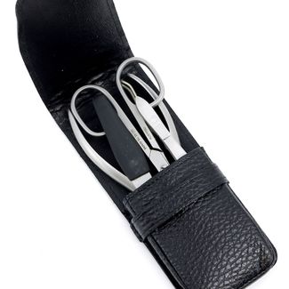 Маникюрный набор Dovo, 4 предмета. Инструменты: ножницы универсальные, кусачки для ногтей, пилка металлическая, пинцет наклонный. Футляр: натуральная кожа (вол), цвет черный. Размер 5,5 x 2,5 x 13 см None Возможен самовывоз. Есть доставка.