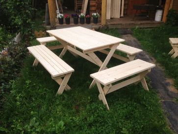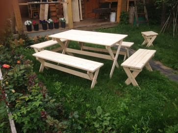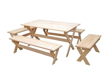 Комплект складной мебели из массива дерева (сосна шлифованная, ель шлифованная). Родированная фурнитура. Комфортная эксплуатация, небольшой вес, компактность хранения. Комплектация: Стол складной 1500х840х750 мм – 1 шт. Лавка складная 1500х335х450 мм – 2 шт. Лавка складная 1000х335х450 мм – 2 шт. Вес комплекта – 54 кг Объем комплекта в сложенном виде – 0.55 м.куб.