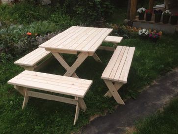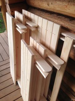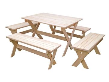 Комплект складной мебели из массива дерева (сосна шлифованная, ель шлифованная). Родированная фурнитура. Комфортная эксплуатация, небольшой вес, компактность хранения. Комплектация: Стол складной 1200х840х750 мм – 1 шт. Лавка складная 1200х335х450 мм – 2 шт. Лавка складная 1000х335х450 мм – 2 шт. Вес комплекта – 41 кг Объем комплекта в сложенном виде – 0.47 м.куб.