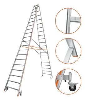 Характеристики к Лестница-стремянка Эйфель Комфорт-Профи Роллер 2х20 с двухсторонним восхождением Рабочая высота, м: 6,68 Длина в сложенном виде, м: 5,65 Кол-во ступеней: 2x20 Вес, кг: 46,6 Материал: Алюминий Тип: Профессиональная Двухсекционная алюминиевая лестница-стремянка Комфорт-Профи Роллер 2х20 На лестницах серии «Комфорт-Профи Роллер» направляющие выполнены из алюминиевого профиля 73 мм овального сечения. Такой профиль выдерживает большие нагрузки, чем прямоугольный. Его удобно дер...