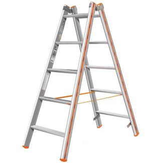 Характеристики к Двухсекционная алюминиевая лестница-стремянка Эйфель Комфорт-Профи 205 Длина в сложенном виде, м: 1,44 Высота в виде стремянки, м: 1,37 Кол-во ступеней: 2х5 Вес, кг: 8,8 Материал: Алюминий Тип: Профессиональная Двухсекционная алюминиевая лестница-стремянка Комфорт-Профи 2х5 ступеней На лестницах серии «Комфорт-Профи» направляющие выполнены из алюминиевого профиля 73 мм овального сечения. Такой профиль выдерживает большие нагрузки, чем прямоугольный. Его удобно держать при ...