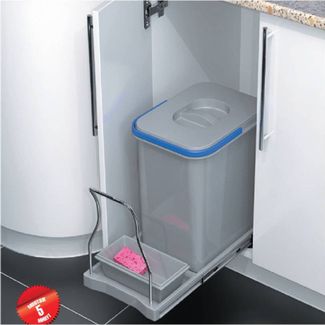 Комплектация: 1 съемное пластиковое ведро объемом 15 л, пластиковая крышка, пластиковые ручки, пластиковый лоток, опорная пластиковая рама, шариковые направляющие полного выдвижения, хромированная ручка, хромированный ограничитель, поводок для выдвижения, крепежная фурнитура. None