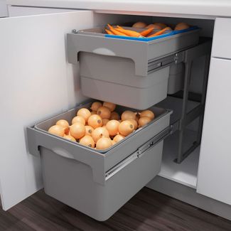 Комплектация: 2 съемных пластиковых ведра объемом по 15 л с пластиковыми ручками и 2 пластиковыми крышками, 1 съемное пластиковое ведро объемом 34 л с металлическими ручками, опорная пластиковая рама, шариковые направляющие полного выдвижения, крепежная фурнитура. Тех. размеры: высота 665 мм, глубина 485 мм. None