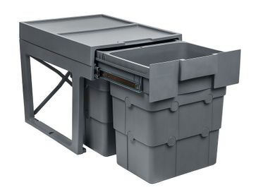 Комплектация: 2 складных съемных пластиковых ведра объемом по 16 л, опорная пластиковая рама, шариковые направляющие полного выдвижения, крепежная фурнитура. Тех. размеры: высота 346мм, глубина 469 мм. None