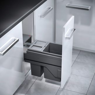 Комплектация: Рама, общая стационарная крышка из металла с серебристым покрытием, направляющие полного выдвижения с функцией Soft-Control, крепление фасада, ведро 10 литров с крышкой из серого пластика, ведро 15 литров, шаблон для монтажа, крепеж. None