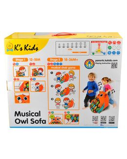 С интерактивной игрушкой K s Kids Музыкальная сова можно играть в подвижную игру "Кто успел?". Смысл игры: пока звучит музыка - бегать вокруг совы, когда музыка остановилась - как можно быстрее сесть на игрушку. Если сесть вовремя, зазвучит весёлая музыка. Если сесть раньше времени, сова грустно ухает. У модели шуршащие крылышки и ушки, пищалка в клюве и вибрирующий механизм внутри. Наличные, Visa/MasterCard, Яндекс.Деньги, WebMoney Возможен самовывоз. Есть доставка.