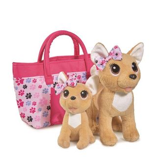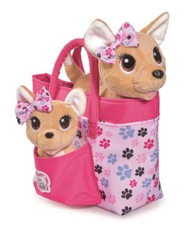 Стильная собачка Чихуахуа с сумочкой из серии "Чи Чи Лав" - это оригинальный комплект, где сохранена общая идея, но добавлена изюминка. В специальной сумочке сидят сразу две собачки - мама и дочка. Они похожи друг на друга, как две капли воды, даже бантики на ушках одинаковые, отличаются только размерами. Для этого в сумочке имеется не только основное отделение, но и дополнительный боковой карман. Сумка украшена такими же узорами, как бантики собак. Имеется две удобные ручки для переноски. None
