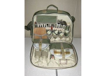 Материал сумки:600D полиестр. В задней части имеется большой отдел для хранения продуктов. Передняя часть включает в себя набор посуды для пикника на 4 персоны. Впереди и по бокам сумки имеются карманы. Размеры: 45х20х34см. Все компоненты набора видны на фотографии. None